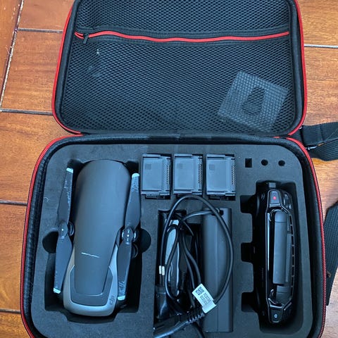 DJI Mavic Mini -kameradrooni 3 akkua kaukosäätimellä. Mukana kovakantinen DJI-kantolaukku, jossa muotoillut lokerot dronelle, ohjaimelle ja tarvikkeille. Kuvissa näkyy myös akku ja lataus-/liitäntäkaapeleita. Kompakti ja kevyt laite ilmakuvaukseen ja videointiin. Tarkemmat tekniset tiedot, kuten kameran tarkkuus, lentoaika ja kantama, kannattaa varmistaa valmistajan ohjeista DJI Mavic Mini -mallille.