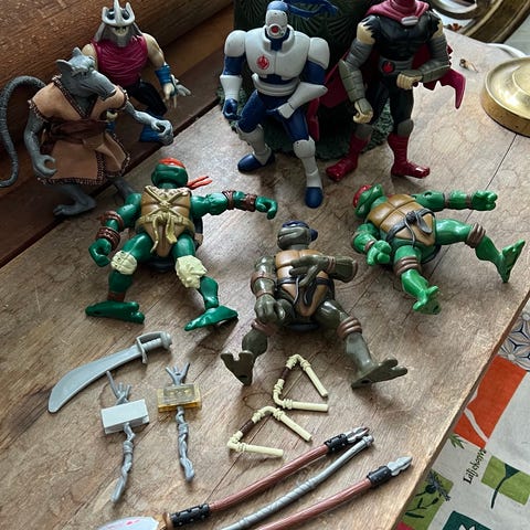 Teenage Mutant Ninja Turtles toimintahahmosetti, johon kuuluu useita kilpikonnahahmoja, rottahahmo sekä erilaisia ajoneuvoja ja irtoaseita. Mukana on muun muassa moottoripyörä, potkulauta ja rullalauta sekä useita irtokäsivarsia ja varusteita. Hahmot ja tarvikkeet ovat muovia, väritykseltään pääosin vihreitä, ruskeita ja harmaita sarjan tunnusomaisilla yksityiskohdilla. Sopii leikkeihin ja kokoelmakäyttöön TMNT-teemasta kiinnostuneille.