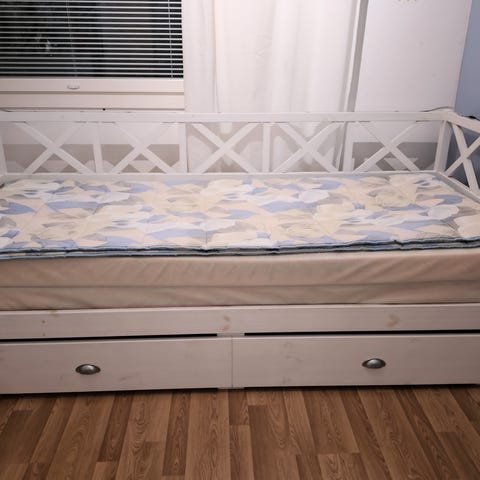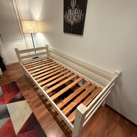 IKEA levitettävä sänky sälepohjalla. Voi pitää 80cm-160cm. Valkoinen runko ja puinen sälepohja. Yhden 80cm x 10cm patjan saa mukaan. (Jos et halua -30€ hinnasta pois)