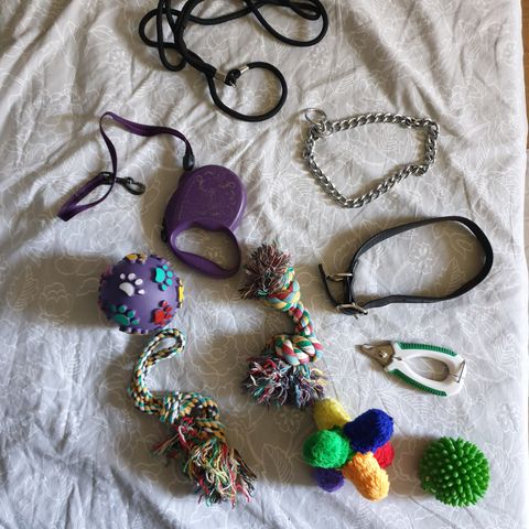 Peti koiranpennulle, kahdet valjaat (kahta kokoa), harjoitushihna, pennun kynsisakset, sadetakki (hurtta), kaksi topattua takki (hurtta), 3 villapaitaa (eri kokoisia)