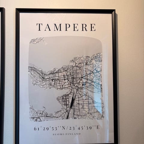 Joensuu-juliste ja halutessaan saa mustat kehykset mukaan. Kehyksen lasissa on hieman jälkiä mutta juliste siisti.
