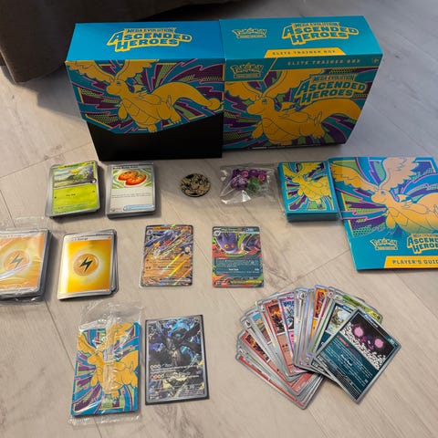 Pakettiin mukaan ME02.5 Pokemon Ascended Heroes Elite Trainer Boxin (ETB) Dragonite kolikko ja pelinopat.