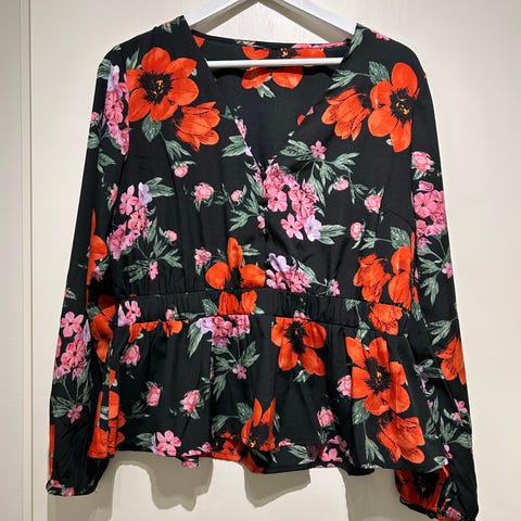 Peplum toppi. Koko L. Väri musta. Materiaali polyesteriä ja elastaania. Topissa on leveät olkaimet, V-pääntie edessä ja selässä sekä hieman levenevä helma. Sopii käytettäväksi arjessa tai kerrospukeutumisessa esimerkiksi neuletakin tai jakun alla.