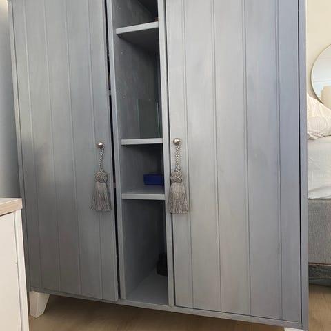 Valkoinen liinavaatekaappi persoonallisilla nupeilla. Hyvässä kunnossa.