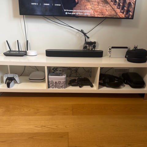 IKEA tv-taso musta. Tv-tasossa on avoimia hyllyjä ja suljettuja säilytyslokeroita esimerkiksi mediatoistimille, pelikonsoleille ja muille laitteille. Sopii olohuoneeseen television alle ja tarjoaa säilytystilaa myös peleille, elokuville ja tarvikkeille.
