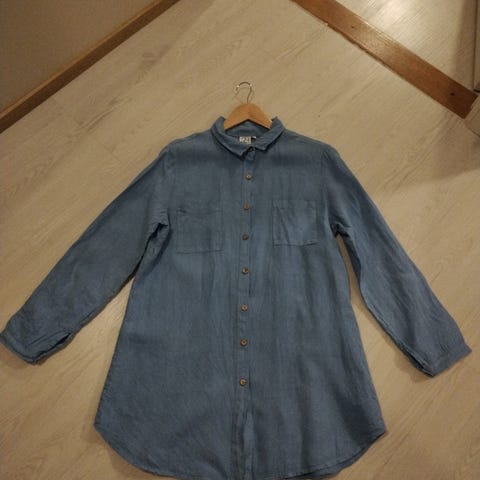Vaaleanpunainen lyhyt pellavasekoitemekko. Kuvissa Materiaali lappu. Kietaisumallinen ja lyhyet pienet puhvihihat. Pituus niska-helma 78