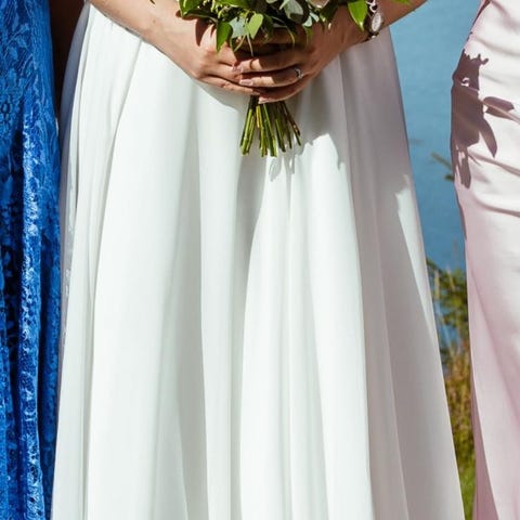 Mukaan tulee pitkähihainen pitsibolero (koko selän mitalta napit), pitkä huntu ja pukupussi.