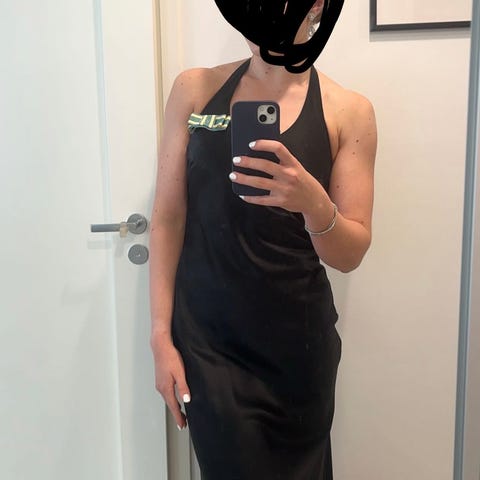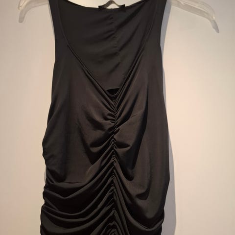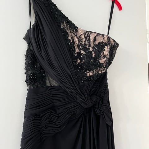 Musta glitteryläosainen iltapuku, kokolappua ei saatavilla mutta vastaa kokoa S. Venyvää kangasta, tosi mukava päällä. Selässä vetoketju