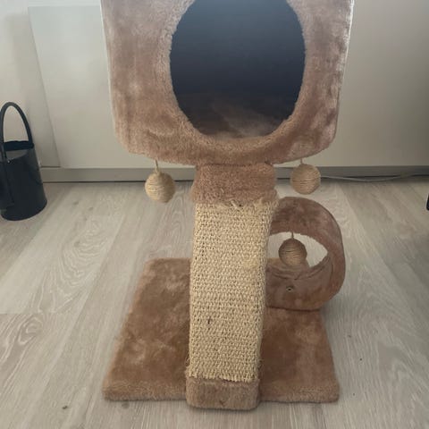 Raapimispuu kissoille. Vaalea, neutraali sävy. On myös lisäosia joilla tän saa korkeemmaksi ja seinään kiinnitettyä, sekä toisen makuupisteen lisättyä. Kunto selkeästi kissan puolesta rakastettu ja käytetty, mutta toimii vieläkin.