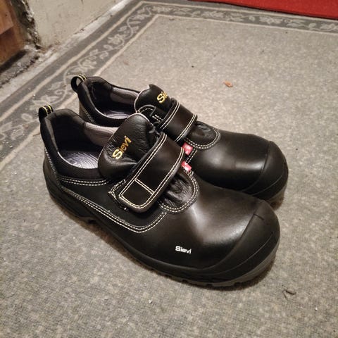 Sievi työkengät kokoa 44. Väriltään mustat, vaaleilla tikkauksilla. Nauhallinen malli, jossa matala varsi ja paksu kumipohja. Sopivat työ- ja suojajalkineiksi erilaisiin olosuhteisiin, joissa tarvitaan tukevat ja peittävät kengät.