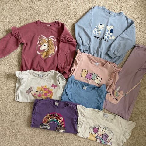 Hyväkuntoisia, ehjiä ja tahrattomia vaatteita yhden lapsen käytöstä.