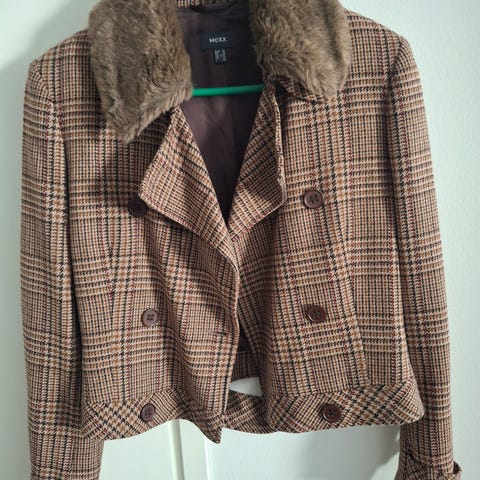 Mexxin vuorillinen takki. Materiaali 50% villaa, 50 % polyesteria ja vuori 100% asetaattia. Koko 40. Vähän pidetty. Kaksi sivutaskua, vyö.