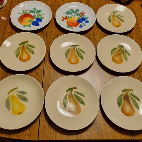 Kolmenlaisia Arabian lautasia. Kaksi kultareunaista syvää lautasta, kultauksessa kulumaa muuten siistit.