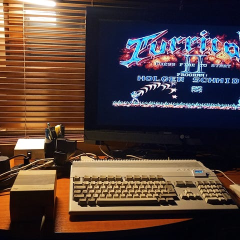 Päällisin puoli kuvan kuntoinen amiga 500, lisämuisti, virtalähde, hiiri ja johto, jolla saa äänet ja kuvan scart liittimen kautta näyttöön ja jokunen disketti.