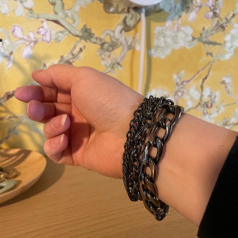 Snö of Sweden naisten rannekoru. Materiaalina teräs. Kuvissa näkyy kaksirivinen, tummansävyinen ketjumainen malli, jossa on lukko ja pieni pyöreä laatta. Pituus mitattuna noin 18–19 cm. Huippukunto, ei mitään käytön jälkiä!