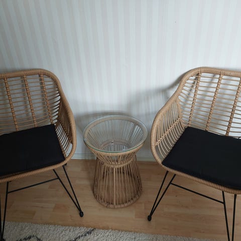 Parvekekalustesarja, johon kuuluu kaksipaikkainen sohva, kaksi nojatuolia ja matala suorakaiteen muotoinen pöytä. Kalusteet ovat harmaata, rottinkia muistuttavaa materiaalia ja niissä on harmaat istuintyynyt. Pöydässä on lasinen pöytätaso. Sopii käytettäväksi parvekkeella tai terassilla istuskeluun ja oleskeluun.