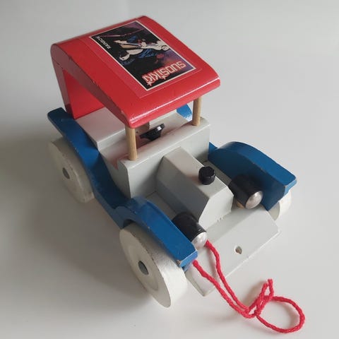 Puuinen leluauto klassikko-tyylisenä mallina. Autossa on keltamusta väritys, pyörivät puupyörät ja yksityiskohtia kuten ajovalot, jäähdyttimen ritilä ja avoin ohjaamoaukko. Sopii leikkiautoksi tai koriste-esineeksi. Valmistusmateriaali on lakattua puuta, osin maalattuna mustaksi.
