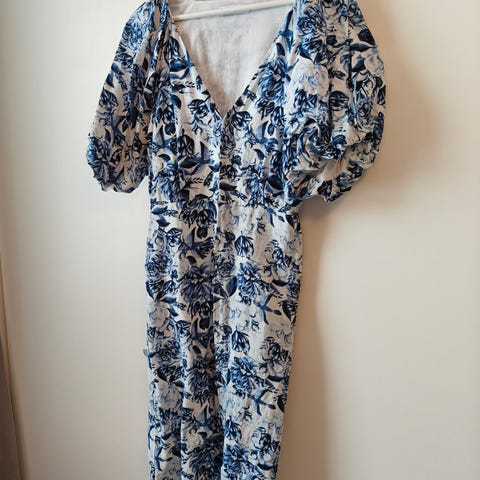 Ihana pellavamekko kirkas vaaleansininen..kauniit olkaimet pitsiä..ei pidetty sovitettu vain..mitta olkain solki 24cm koko pituus mekolla 135cm ..rypytyskohdasta mitta 52cm ylempää 47cm...ei lemmikkejä tai tupakointia taloudessa