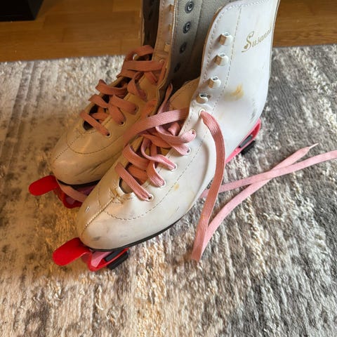Valkoiset taitoluistimet, koko 40. Perinteinen nauhakiinnitys ja terät taitoluisteluun. Soveltuvat esimerkiksi harrastekäyttöön luisteluun jäähalleissa tai ulkojäällä. Merkkitietoa ei saatavilla.