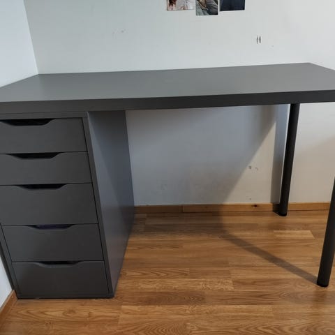 Työpöytä kulmamallinen. Sivustalla olevassa osassa hyllyt, kaappi ja laatikko. Siisti, tummanruskea. Mitat kysymällä.