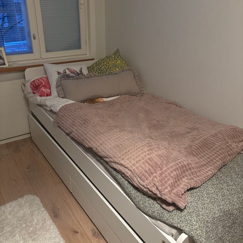 IKEA SLÄKT yhden hengen lastensänky, jossa vierassänky ja säilytyslaatikoita sängyn alla. Väri valkoinen. Sivuissa ja laatikoissa voi olla käytön jälkiä ja naarmuja, ei mitään käyttöä haittaavaa. Hyvä vielä seuraavalle!