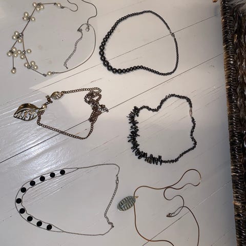 Korusetti, johon kuuluu erilaisia rikkinäisiä kaulakoruja ym.. Kuvasta löytyvät tarjolla olevat. Tästä tarvikkeita vaikka uusiin koruihin.
