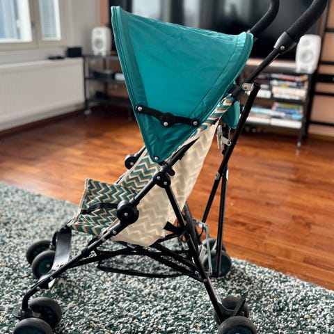Bumbleride lastenrattaat turkoosilla kankaalla. Rattaissa on säädettävä selkänoja, turvakaari ja viisipistevaljaat. Kolmipyöräinen runko, jossa suuret ilmakumirenkaat ja kääntyvä etupyörä. Alla tavarakori kuljetusta varten. Rattaat ovat kokoontaitettavat säilytystä ja kuljetusta varten. Soveltuvat lapsen kuljettamiseen vaunuiässä eteenpäin istuen.