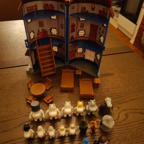 Erinomaisessa kunnossa oleva muumitalosetti, kalusteet ja 15 muumihahmoa.