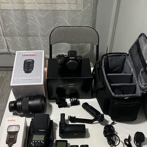 Myydään varusteltu Sony α7 IV -kokonaisuus kalustopäivityksen vuoksi. Kamera on ostettu uutena keväällä 2023 ja se on ollut erittäin tarkalla käytöllä. Runko on ulkoisesti ja teknisesti virheetön, ei kulumia tai käytön jälkiä. Shutter count vain 24673.