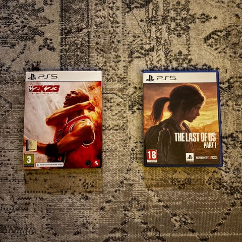 Playstation 5 pelipaketti, joka sisältää kolme fyysistä peliä koteloineen: