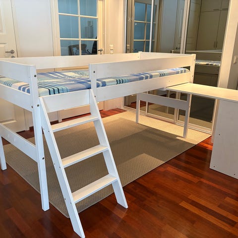 Käytettynä ostettu hyvä puoli parvisänky. Lapsiarkeen kuuluvia kolhuja. Tukeva ja hyvä sänky silti. Lipaston saa vedettyä työpöydäksi halutessaan.