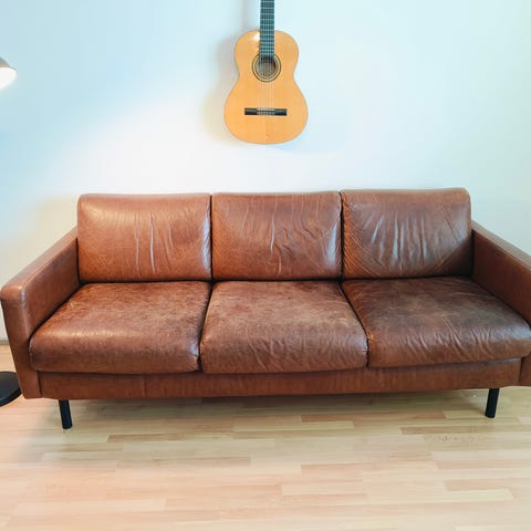 Nahkasohva ja kaksi lepotuolia