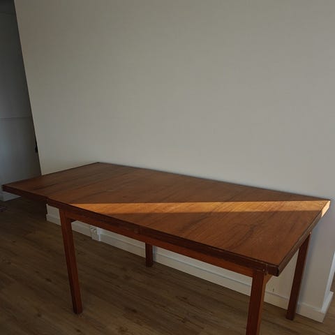 Myydään kuvan mukainen teak-puinen ruokapöytä. Arvioisin pöydän olevan 60-luvulta. Pöytä on ostettu kunnostettuna Gusta Designilta ja ollut kovassa käytössä. Pöydän pinnassa on yksittäisiä käytönjälkiä, mutta kokonaisuutena pöytä on hyvässä kunnossa. Mukaan tulee myös jatkopala.