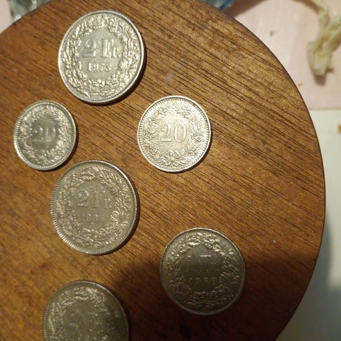 Sveitsi kolikot, hopeanvärinen setti. Kokoelmassa useita erikokoisia kolikoita, joissa on vaakuna- ja henkilöaiheisia kuvioita. Soveltuu esimerkiksi keräilyyn tai numismatiikasta kiinnostuneelle. Myydään yhtenä eränä kuvien mukaisesti.