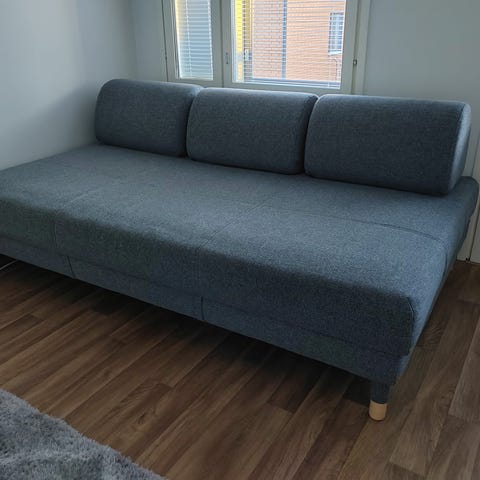 Myydään lähes käyttämätön IKEA vuodesohva, väri vaaleanharmaa. Kahdenistuttava sohva, joka avautuu vaivattomasti vuoteeksi eteenpäin vedettävällä mekanismilla. Sohvassa on leveät käsinojat ja irrotettava istuinosa, joka muodostaa yhdessä selkänojan kanssa makuualustan. Mitat auki vedettynä: 120 x 205 cm. Sohvaa ei ole koskaan käytetty oleskeluun/istumiseen. Se on ostettu varavuoteeksi, mutta käyttö jäänyt olemattomaksi (vuodemekanismia käytetty vain muutaman kerran). Kangas täysin ehjä ja moitteeton (ei likaa, kulumia, hajuja yms). Kahden aikuisen talous (ei lemmikkejä eikä lapsia). Vain nouto, maksu noudettaessa MobilePay. HUOM: Ostaja tuo omat kantajat mukaan. Sijaitsee kerrostalossa 1.krs (hissi on, mutta ei varmuutta mahtuuko sohva hissiin). Sohva on painava!