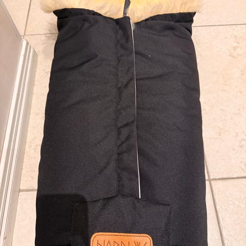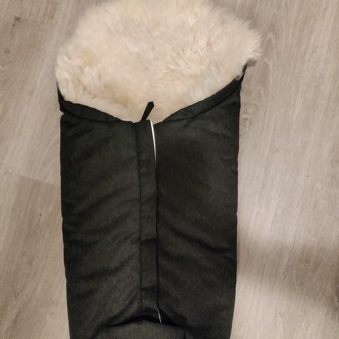 Nordlys mustavalkoinen lampaantaljalämpöpussi. Vetoketju ja nepparit edessä. Takana aukot viispistevaljaille. Hyvä käytetty kunto, hieman talja nukkaantunut vauvan pään kohdalta.