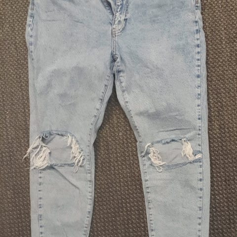 Hyväkuntoiset, ehjät, tahrattomat. Korkea vyötärö ja leveät lahkeet. Pesulappu leikattu.