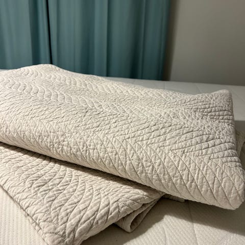 Päiväpeitto ja kaksi tyynyä. Luo rauhallisen tunnelman. Erittäin siisti ja ajaton. Sopii 140 ja 160 kokoisten sänkyjen päiväpeitoksi. Mitat noin 272 x 225. Tyynynpäälliset myydään sisätyynyjen kanssa. Sisätyynyn mitta 50x50 (kuvassa).