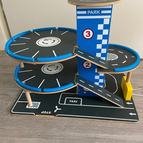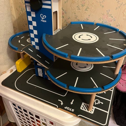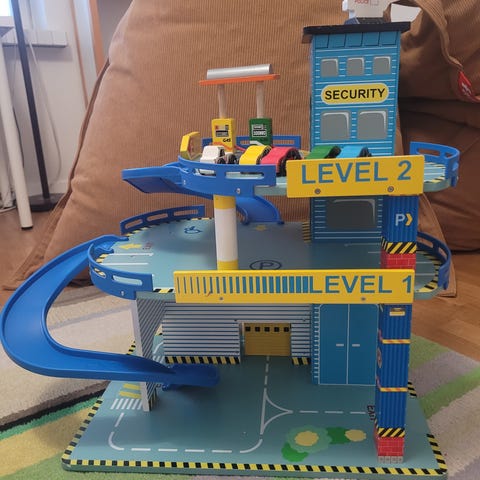 Puinen/muovinen parkkitalo. Jykevä rakenteeltaan.