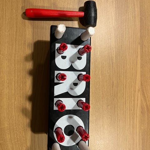 Pakkaukseen kuuluu penkki, jossa on punaisia tappeja, joita voi koputella leikkivasaralla.