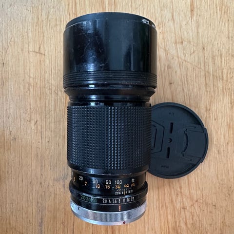 Meyer-Optik Görlitz Orestor 2.8/100 objektiivi M42 kierteellä. Mukaan tulee Canon EOS adapteri, jonka kanssa toimii rungon tarkennuksen kuittaus. Hyvin siro mini-tele 100mm f2.8 objektiiviksi.