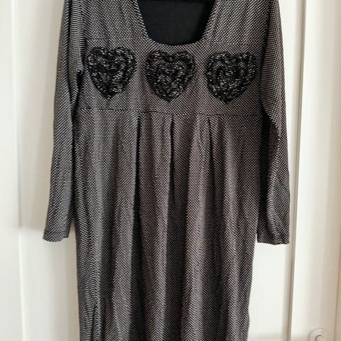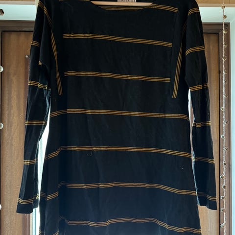 Masain mekko/tunika, 100% viskoosia. Koko S, mutta menee helposti M kokoiselle myös. Edessä yksi tasku ja toisella puolella helmaa halkio. Pesun jäljiltä kuvassa kovin ryppyinen, mutta muuten siis täysin ehjä ja siisti. Väri musta/beige (ei siis valkoiset kuviot kuten kuva vääristää, vaan enemmänkin beigeen taittuva).