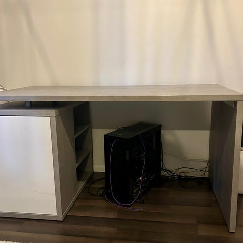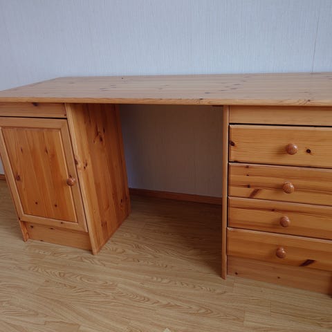Vanha työpöytä, ollut käytössä noin 20 vuotta. Hieman kolhuja ja naarmuja, ylintä vetolaatikkoa pidetty kasassa hieman teipillä. Ihan käyttökelpoinen pöytä vielä jos jollekin kelpaa. Ylimmän vetolaatikon saisi lukkoon, mutta avainta ei löydy.