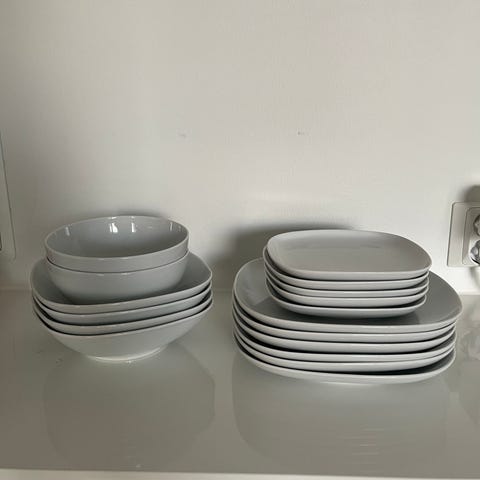 Ikean FÄRGKLAR astiasto, 18 osaa, matta tummanharmaa. Perus käytön jälkiä löytyy.