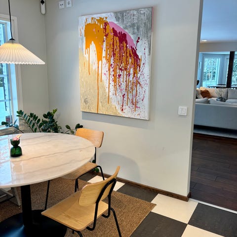 Iso abstrakti taulu, jossa harmaan ja kuparin sävyisiä pintoja. Maalaus on suorakulmainen ja sopii esimerkiksi olohuoneen tai muun oleskelutilan seinälle sisustuselementiksi. Värit ovat vaaleita ja neutraaleja, mikä helpottaa yhdistämistä eri sisustustyyleihin.