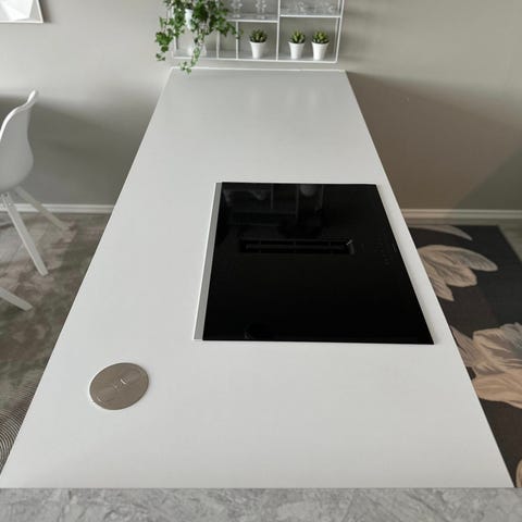 L-mallinen keittiötaso. Kahdella Bachmann Twist pistorasia paikalla. Tason pidempi sivu 3283 mm ja lyhempi 2083 mm. Tason paksuus 30 mm. Toisen aukon mitat (Samsungin liesi): leveys 560 mm ja syvyys 490 mm. Aukon mitat (allas): leveys 540 mm ja syvyys 485 mm.