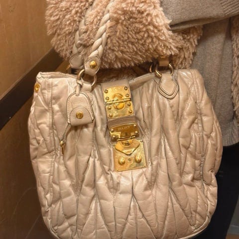 Matelasse-nahkainen avain- ja korttikotelo. Ostettu Milanosta Miu Miun liikkeestä 5/2014. Ovh. 190 € silloin, nyt vastaava malli ilman avainrengasta 420 €. Ei ole käytetty oston jälkeen. Väriä ei enää saatavilla.