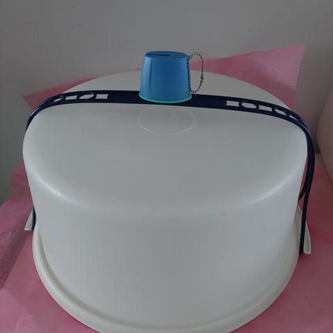 Tupperware kakkuvati muovinen säilytys- ja kuljetusastia leivonnaisille. Valkoinen kupu ja sininen kantokahva, joka helpottaa kakkujen ja muiden leivonnaisten siirtämistä. Sopii kakkujen, piirakoiden ja muiden tarjottavien säilyttämiseen ja kuljettamiseen
