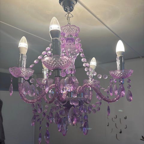 Myydään muuton vuoksi kaunis valkoinen kattovalaisin, jossa koristeelliset lasipaneelit ja riippuvat kristallit. Antaa pehmeän ja tunnelmallisen valon.
