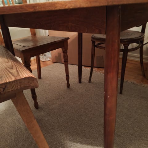 Uniikki ruokapöytä, jossa pöytälevynä toimii vanha puinen ovi. Oven päällä on läpinäkyvä lasikansi. Pöydän jalat on tehty kahdesta valurautaisesta ompelukoneen jalustasta, jotka tukevat pitkää pöytälevyä. Pöydän pinta on maalattu vaaleaksi ja maalipinnassa on kulumaa, joka antaa pinnalle rouhean ja vanhan vaikutelman. Sopii ruokapöydäksi tai työpöydäksi tilaan, jossa tarvitaan pitkää ja tukevaa pöytää. Lasissa pieni lohkeama reunassa. Ei ole vaikuttanut meillä mitenkään. Ei ole terävä tms.